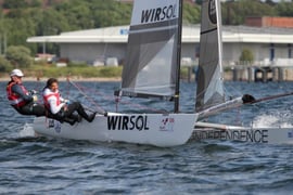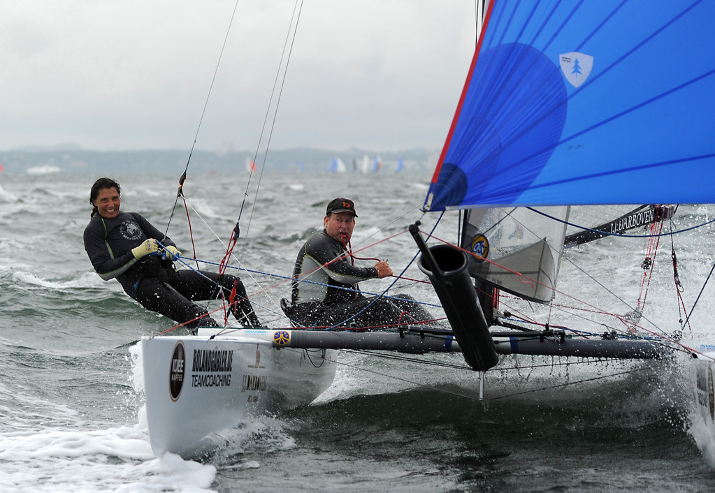 Dabei kam es zu vielen Führungswechseln und spannenden Runden. Winddreher bis 45 Grad verlangten ein waches Auge und viele spontane taktische Entscheidungen. Wir kamen damit auch sehr gut zurecht, versegelten uns aber leider im ersten Rennen und mussten ein Rennen wegen eines Gennacker Verwicklers aufgeben. Trotzdem konnten wir zwei einzelne Rennen gewinnen und wurden am Ende hinter den Australiern Bret Burvill & Ryan Duffield die Gesamtzweiten.