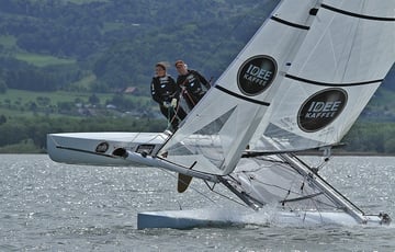 Beim Speedsailing Rennen, welche im Anschluss an die normalen Grand Prix Rennen veranstaltet wurden, lief es sportlich auch wesentlich besser für uns. Dicht unter Land und nah an den Zuschauern segelten wir kurze knackige Rennen die spannender kaum sein konnten. Der Kurs wurde so ausgelegt, das wir einen Halbwind starteten. So war es auch möglich, das wir nur bei 6 Knoten Wind unter Gennacker im Doppeltrapez segelten. Besser konnten man diesen neue Art des Segelns nicht vorstellen. Wir hatten für diese kurzen Sprintrennen die beste Taktik und gewannen das Finale der ersten deutschen Speedsailing Grand Prix vor Lindau.