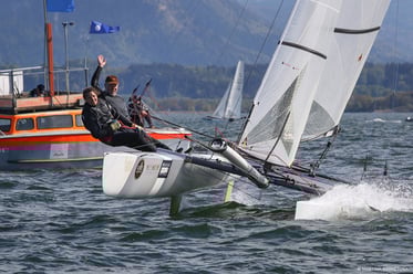 Und das ging auch gleich gut los bei Böen bis zu 6 Windstärken. Segel dicht und fliegender Start. Das wir dabei auf ein Reff im Großsegel verzichtet hatten, wurde uns dann aber auf den raumen Kursen fast zum Verhängnis. Und auf der anderen Seite des Sees stand auch noch eine kurze steile Welle, die ein Unterscheiden nach dem anderen verursachte. Irgendwie schafften wir es dann doch ohne Kenterung um die Leemarke zu kommen. Ein AC45 machte es besser und lag klar vor uns auf einem langen Amwind Kurs. Nach ein paar Kilometern ruppiger Fahrt, fanden wir auch wieder zu unserem Rhythmus beim Trimmen des Großsegels. Kurz vorm Ziel eroberten wir und die Führung zurück und gingen als Sieger über die Ziellinie. Damit war der Tramontana Sennebogen Cup unser. Über dieses wilde Rennen und das Comeback haben wir uns besonders gefreut. Waren es doch extreme Bedingungen und einige beinahe Kenterungen.