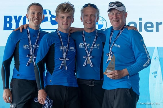 Das Projekt „Team Black Jack“ hat eine ganz besondere Mission. Junge Segler in Ungarn zu sichten und zu fördern. Dazu gehörten Mate Scharf, Balazs Gecse, Litkey Balmaz und Ferenc Tisoczki. Ich wurde als erfahrener Segler und ehemaliger Gewinner des Blauen Bandes (2010) als Segelprofi angeheuert. So gesehen waren wir ein Boot der Generation. Trotz weniger Trainingstage haben wir schnell zu einer guten Teamarbeit gefunden und konnten das Boot in einigen Bereichen optimieren.