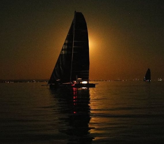 Und da kam unsere Chance. Bei Mondschein und leichter Strömung fanden einen guten taktischen Weg durch die Enge um die Halbinsel Tihany. Wir erwischten im ersten Hauch nach der Rundung einen optimalen Winddreher und überholten kurz vorm Ziel noch 4 Schiffe. Damit war uns der zweite Platz sicher. Hinter dem größeren AC45. Es war kein Gesamtsieg, aber wir fühlten uns als Zweite wie die Gewinner!